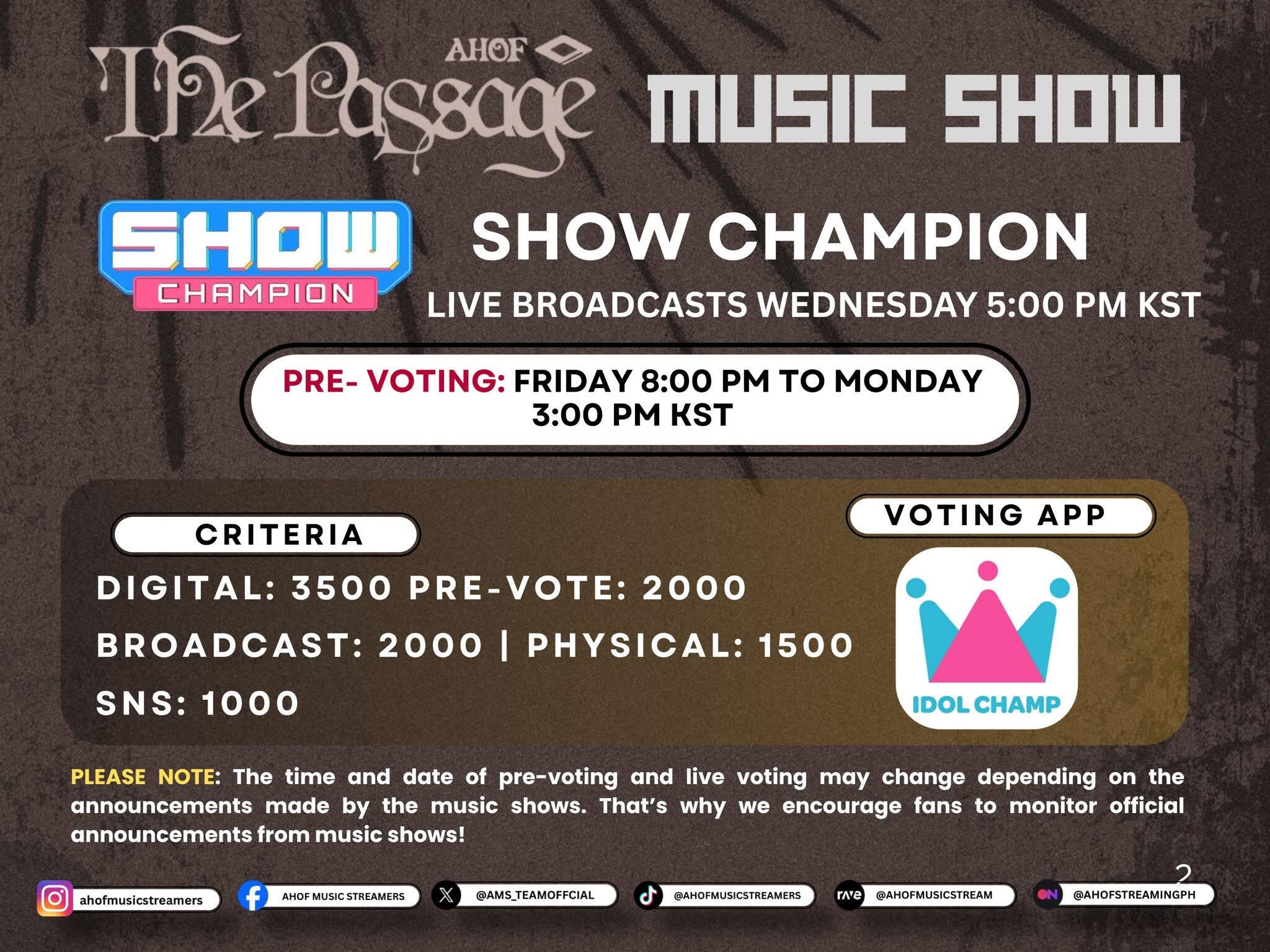 🗓️ SCHEDULETracking Period: Monday – Sunday (week prior to broadcast)Pre-Voting (IdolChamp): Thursday 8:00 PM – Sunday 3:00 PM KSTLive Broadcast: Wednesday, 5:00 PM KSTNote: No live voting for Show Champion.📊 SCORING CRITERIADigital (35% / 3,500 pts):Streaming & downloads from Melon, FLO, Genie, and BugsPhysical (15% / 1,500 pts):Album sales based on Hanteo Chart dataPre-Voting (20% / 2,000 pts):Votes on IdolChamp app (split between KR and Global/CH users)SNS (10% / 1,000 pts):YouTube views on the official music videoBroadcast (20% / 2,000 pts):Song plays and appearances on MBC M TV and related programs (e.g., Weekly Idol)🧩 HOW TO PREPARE✅ Collect Pink & Blue Chamsims