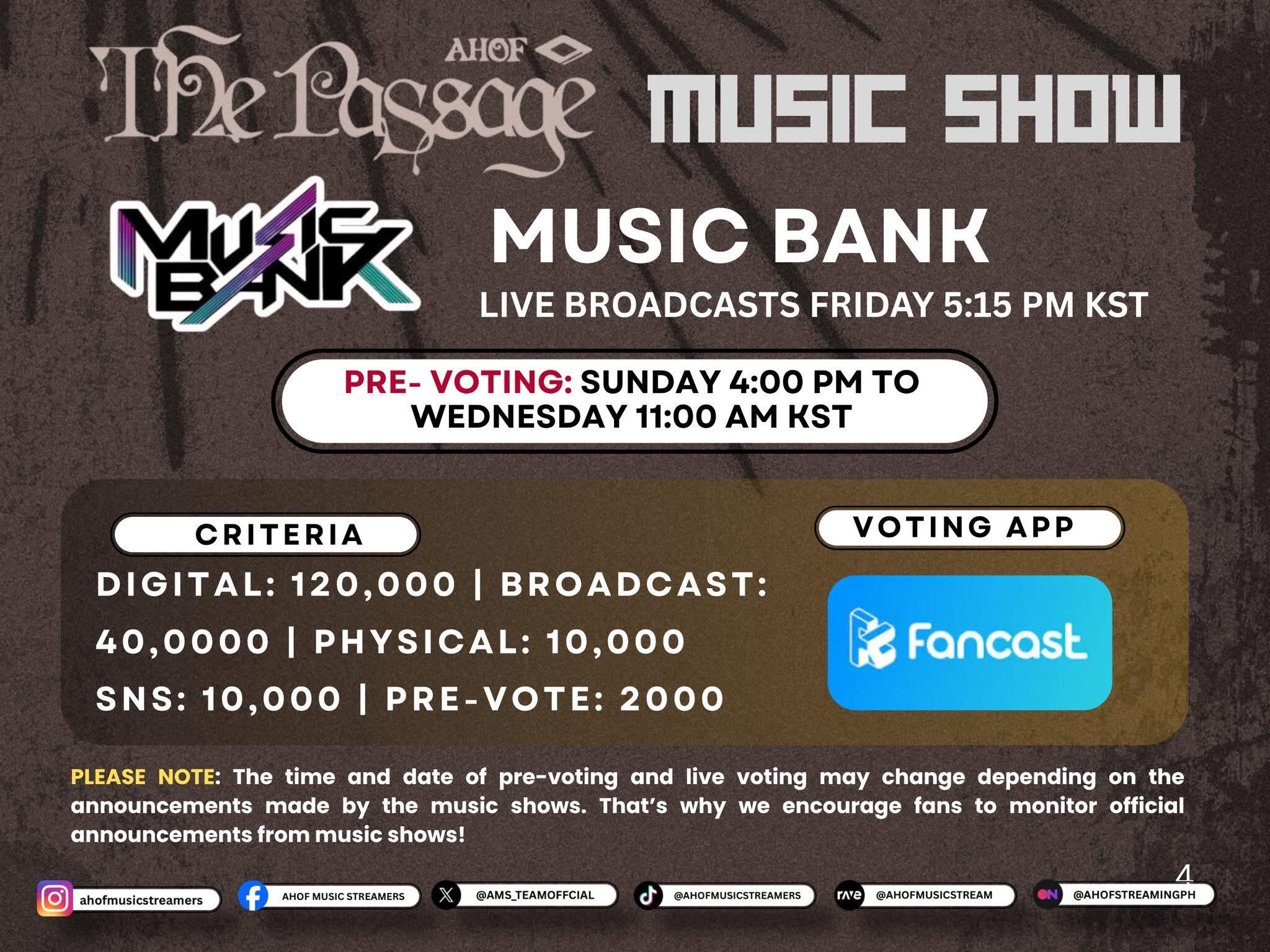 🗓️ SCHEDULETracking Period: Monday – Sunday (week prior to broadcast)Pre-Voting (FANCAST): Sunday 3:00 PM – Wednesday 11:00 AM KSTLive Broadcast: Friday, 5:15 PM KSTNote: No live voting for Music Bank.📊 SCORING CRITERIADigital (60% / 120,000 pts):Based on Circle Chart’s digital data — songs must appear on at least one Korean music chart’s weekly TOP 200Physical (5% / 10,000 pts):Album sales from Circle Chart’s album sales dataPre-Voting (10% / 2,000 pts):Votes cast through the fancast app during the pre-voting periodSNS (5% / 10,000 pts):YouTube and TikTok data provided by Circle ChartBroadcast (20% / 40,000 pts):Performance appearances and song plays on KBS programs, including Music Bank🧩 HOW TO PREPARE✅ Prepare K-Streaming Accounts